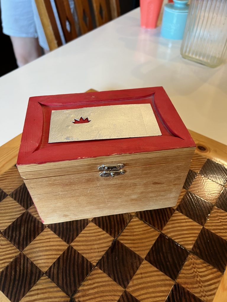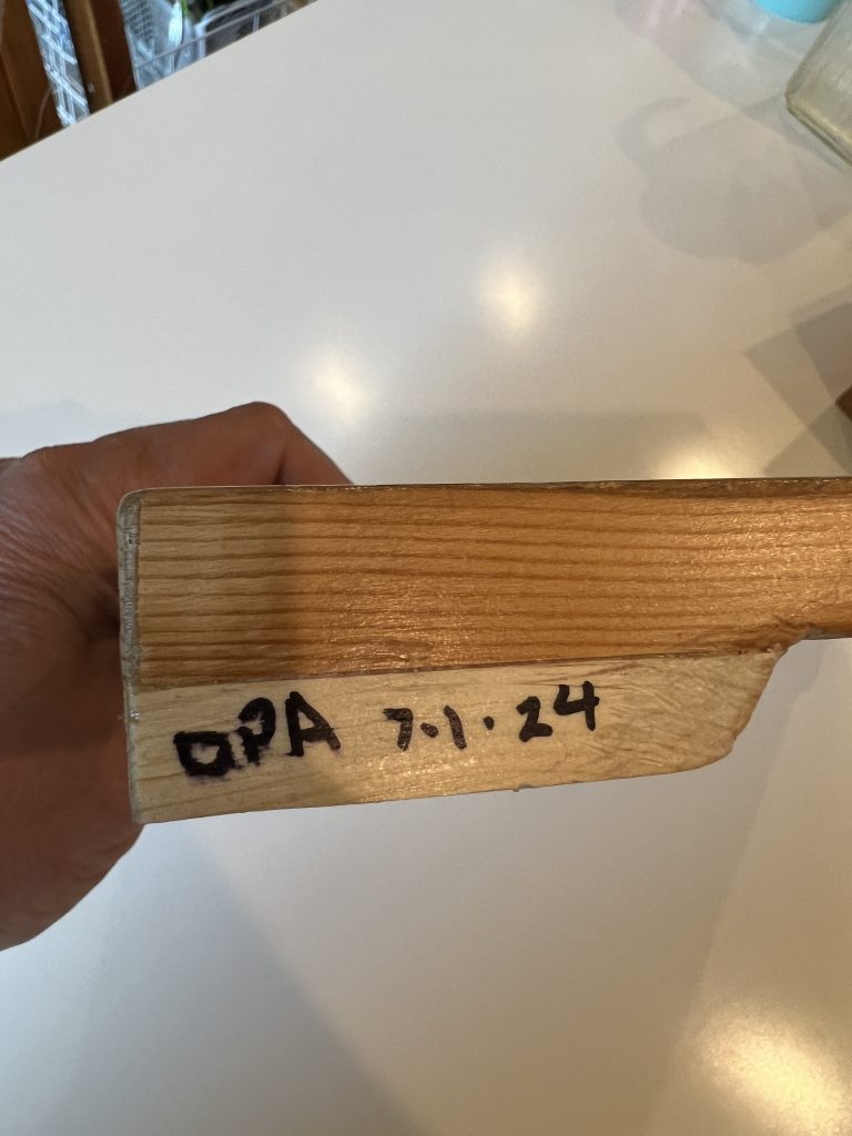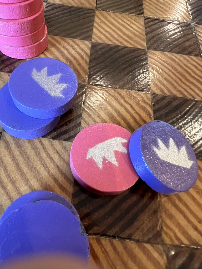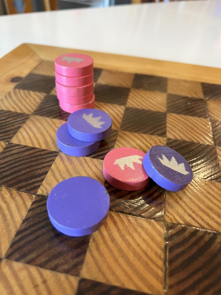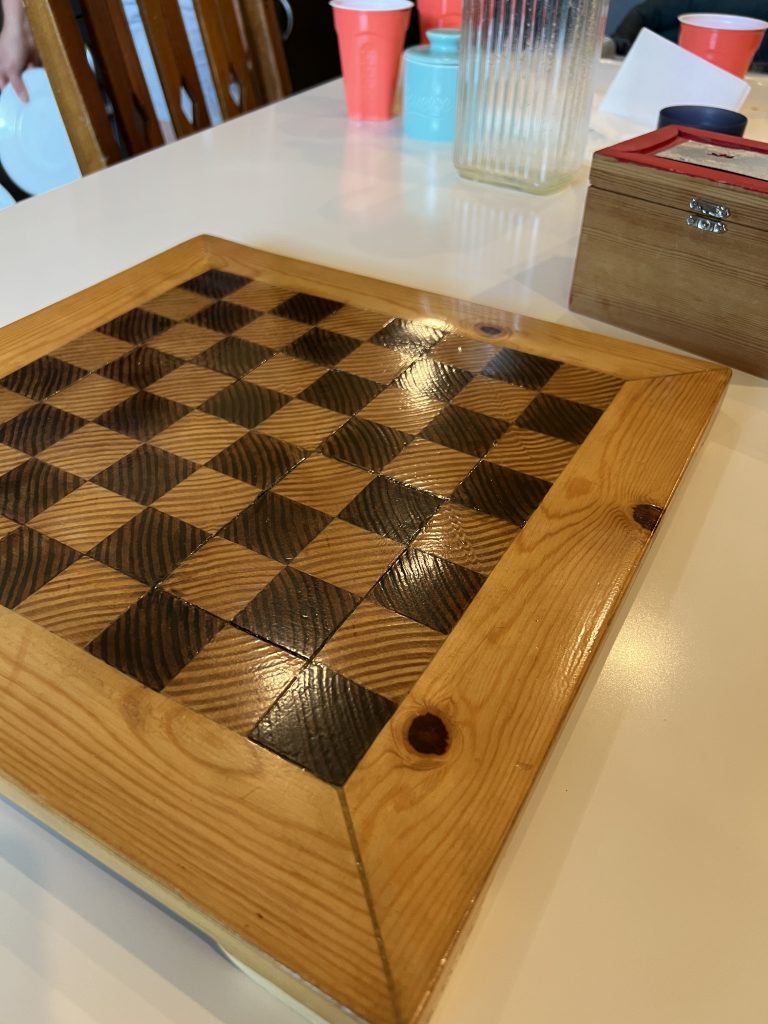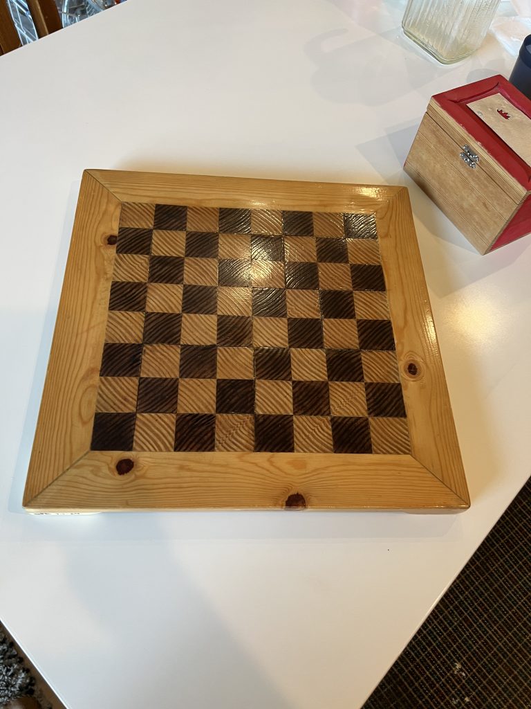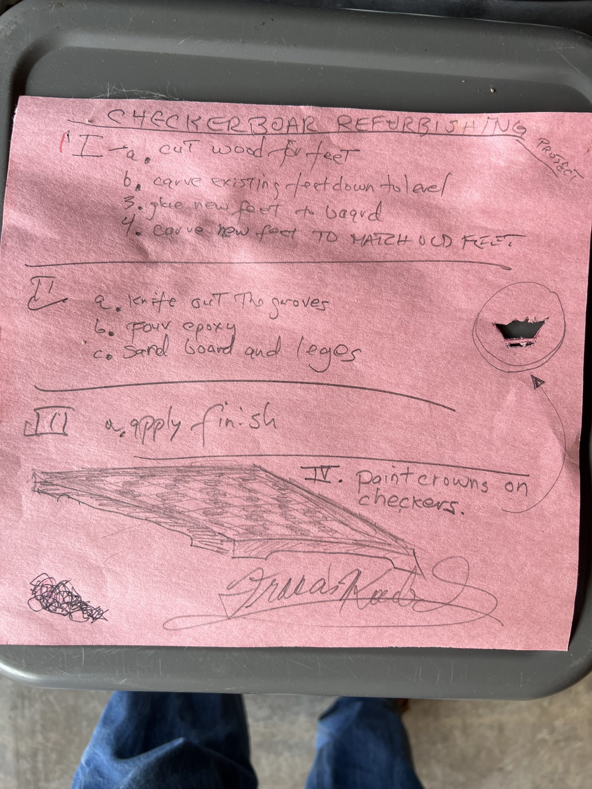 About 25 years ago I made this checkerboard for my children. My son has had this for 10 years or so. It needed some serious refurbishing so I and the two older children worked to fix the broken foot, repaint the checkers and refinish the board.
